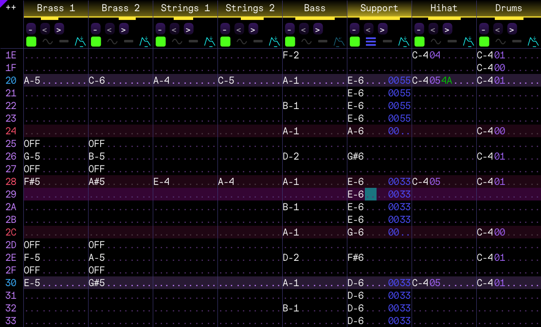 The harp was simple enough, but it still helped me to discover something really useful. Normally when using a tracker you'd double the tempo to have finer control over shorter notes, but I hate doing that and I'd rather not have to. There are other options though, and I discovered an unlikely one: the arpeggio effect. By setting its speed to half of the song's, you can use it to play two notes in a single row, and it works perfectly. It's not even a very convoluted technique, either: just set the number of semitones to whatever you need the second note to be in that specific row, and change it in the next. I will definitely be taking advantage of this discovery in future projects.