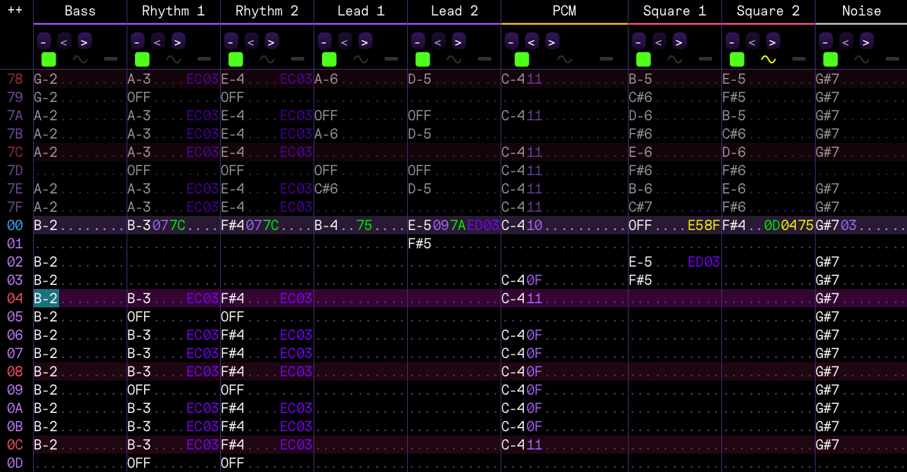 To begin with, Rising Blue Lightning is a surprisingly straightforward track. It has a heavy metal backbone to it, which of course means my metal formula (FM 1 for bass, FM 2 and FM 3 for rhythm guitars panned to each side, FM 4 and FM 5 for lead melodies, FM 6 for PCM drums, Square 1 and 2 for support and noise for hi-hats) fits rather well, but not perfectly. If I had used it like I normally do, I would've been making the same mistake as S.S.H. by murdering its mood and atmosphere at the altar of headbanging madness. See, normally I'd use FM 4 for lead guitar / synth and FM 5 for out-of-tune echo (and I fact I do that in some parts), but in order to maintain the mood, I need synth strings--and not that PSG crap, but my custom ones. So, for a good part of the track, the rhythm section gallops along while FM 5 handles the lead melody and Square 1 does the echo. This way, FM 4 is free to use strings that actually sound like strings. The second square wave can be used to play more notes that add to it, but by themselves, square waves do not carry the same emotional weight.