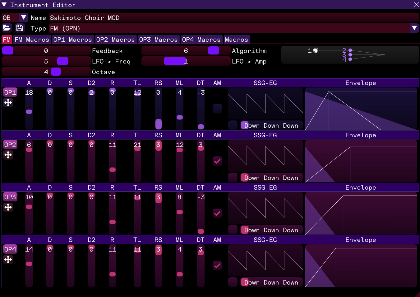 I mentioned the rhythm section already, so let's explain that in more detail. The bass is a little different than usual: Tsukumo's original uses a slap bass with a very noticeable pop. So, I tweaked the Electric Bass patch I normally use (included with Furnace) and raised the multiplier of operator 3 to twelve, giving it a very strong initial high-pitched slap without sacrificing the lower end. I also changed the galloping pattern slightly and accented it with high-hats. The rhythm guitars follow S.S.H.'s rather closely, and the drum samples are from (wait for it) the Arachno Soundfont. Now that's the surprise of the century. I do use a different power snare, just for variety's sake. Incidentally, I didn't go particularly hard with the drums during most of this arrangement because the song doesn't need it.