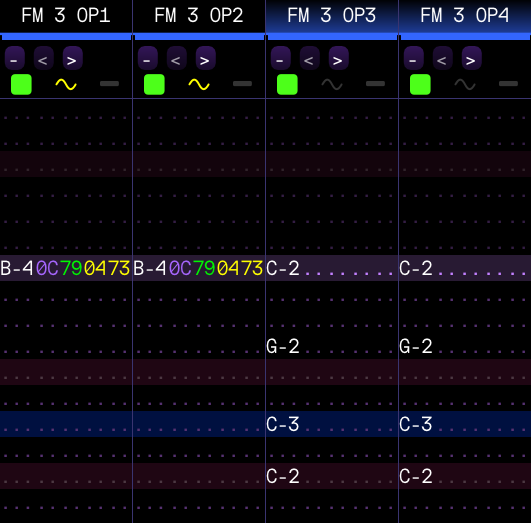 Step number two is the Low Frequency Oscillator (LFO), which was included in the YM2612 specifically to handle vibrato. On the FM macros tab, you can set its speed to whatever you want (I usually set it to 5). On the main tab, you can see the frequency modulation is set to 5 and the amplitude modulation to 1. Finally, the AM boxes for the modulators are ticked. And really, that's it. You can even have software vibrato effects on the pattern if you really need them. In fact, I did need them on channel 3 for a different reason. Let's say operators 1 and 2 are handling simplified strings, and operators 3 and 4 are handling the bass guitar. I want the strings to vibrate but not the bass, which is impossible, because since they're on the same channel, they share the same LFO configuration. That is why, in this case, I applied a software vibrato effect to operators 1 and 2 instead to get my simplified strings to vibrate, whilst the bass remains unaffected.