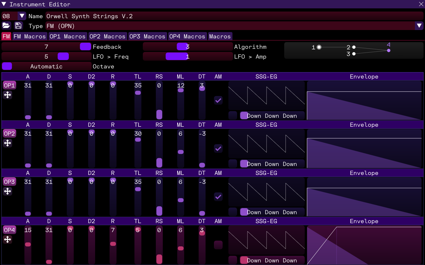 Let's talk about the strings a little bit more, because the console is famous for not being able to replicate such instruments satisfactorily--obviously I feel differently. If you've listened to this piece before reading this or are listening to it now, I think you'll agree my string ensemble sounds quite fantastic. So, how did I make it? Well, in the words of Inglebard: strings vibrate a lot. But that's not a problem on the YM2612: that's what detune and the LFO are for in the first place. If you look at the screenshot I've provided below, you'll notice the operators are set to be slightly out of tune with each other by equal amounts (values like 3 or -3). That makes the sound wobble, which is the first step. But crucially, the multipliers are set really high, which massively intensifies the wobble effect. The reason for this is technical and confusing, but it doesn't matter--you just have to know that it works, because it does. Of course, this means that when you press middle C you get a much higher note, which is annoying--but that's what we have arpeggio macros for. You make one and set it to whatever you need (in this case -31 semitones) to get the sound to match the key you're pressing, and there you go. So, that's step number one.