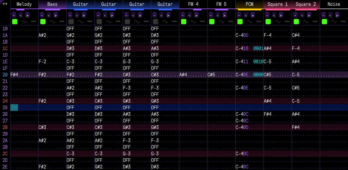 Not being able to rely on my metal formula forced me to get creative with the stereo effects. Normally I'd pan my two rhythm guitars to each side, but this time it's just one guitar on channel FM 3 playing two notes at the same time, so all of it shares the same stereo configuration. So, I panned the strings, sometimes the echo, the main melody, whatever sounded good enough. I often ran out of space on the YM2612 for detuned echoes, so I had to use the SN76489's square waves instead. There are also some orchestra-like accented hits which I came up with, as well as more strings.
