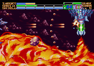 Earthion is the size of a small Neo Geo game, and it bloody well shows. For comparison, Thunder Force IV, often hailed as the best Mega Drive game in the shmup genre, is only 1MB, whereas Earthion approaches 8MB (I'm quoting Koshiro here). This has not gone to waste. It has undoubtedly enabled them to include so many detailed, huge bosses and so many samples, not just for voices, but also for all kinds of snare, hi-hat and cymbal sounds to enhance the drumming far beyond anything ever done on Sega's 16-bit apotheosis of home console engineering.