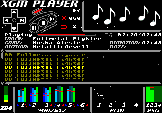 Copying the notes was mostly trivial, like it always is. The instruments? The same ones I've been using for a while. Chunky bass with the total level of one of the operators raised for a higher-pitched slap sound, custom Orwell rhythm guitars, lead guitar and synth strings, "trumpet synth", Thunder Force IV intro synth to enhance the rhythm guitar in some sections, some Time Trax guitar by Tim Follin here and there, Batman orchestra hits and Arachno Soundfont power drums. The formula? The usual: bass on FM 1, panned rhythm guitars on FM 2 and FM 3, lead melody on FM 4, detuned echoes on FM 5, sampled drums on FM 6, square waves for support and noise for hi-hats.