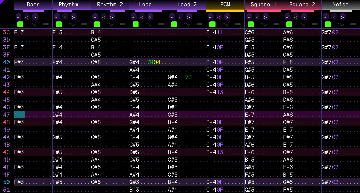 Let's address the elephant in the room I referenced at the beginning: the tempo, which is 294bpm. Technically, the original song's real tempo is half of that--147bpm. But I have enough experience making tracker music to know I'd have to double the tempo and the length of all the notes to have finer control over shorter notes (this is an extremely common technique when using trackers). Now, for better or worse, that meant it would've been a shame to not take advantage of the enhanced precision--and I did just that.