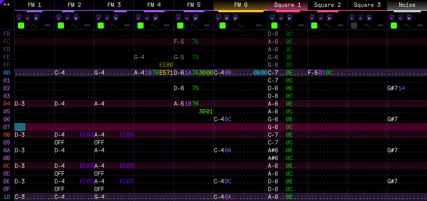 So, channels FM 4 and 5 take turns handling different instruments. In one part, they both use my custom Orwell Strings V.2, playing the same notes at two octaves, but in specific moments, FM 5 changes into orchestra hits momentarily, and you barely notice. When the verses start, I use an instrument I like to call "MO's DoctorSolo", which is quite similar to the synth lead sound used by Tsukumo, on FM 4, while FM 5 handles detuned echoes for thickness. The square waves usually handle the high-pitched crystal-like instrument as well as the echo when there aren't any free FM channels, which is most of the time. Again, I put emphasis on the mood, not just heaviness, and that means making room for a string ensemble on the YM2612 if necessary. During the chorus, I use my trusty "trumpet synth" and I harmonize it with one of the square wave channels, which sounds fantastic. In this particular section, there is absolutely no room left for echoes, so it might stand out to you if you have a fine ear.